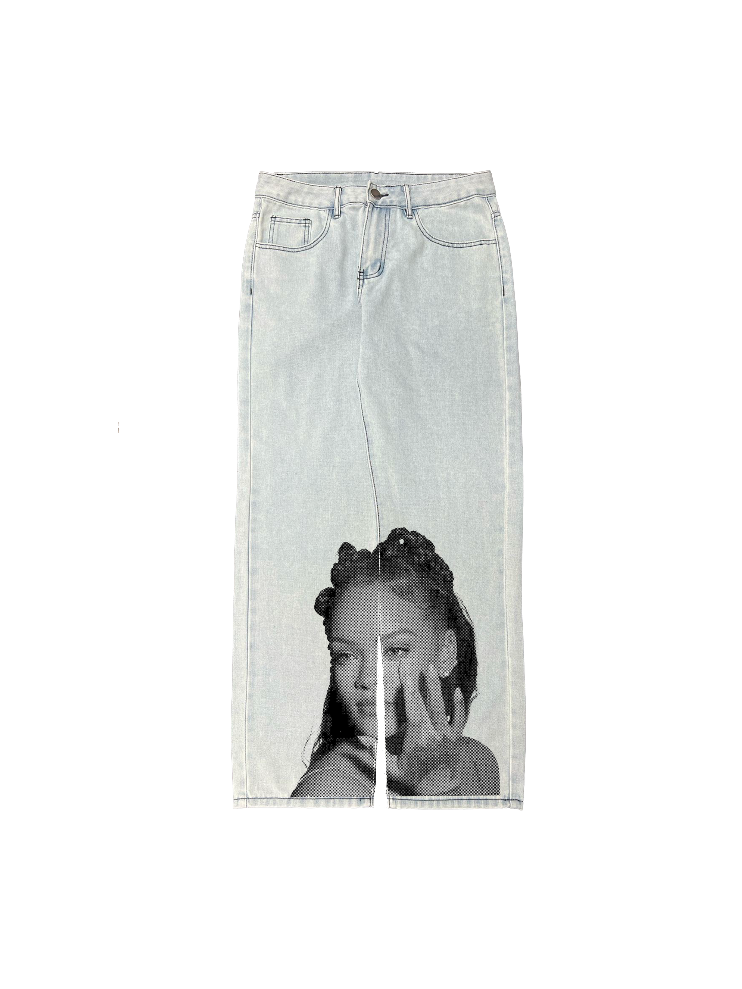 Step up your fashion game with our exclusive Rihanna Artistic Print Jeans. Designed for those who want to make a bold statement, these jeans feature a striking and detailed print of Rihanna, transforming your everyday denim into a canvas of expression.